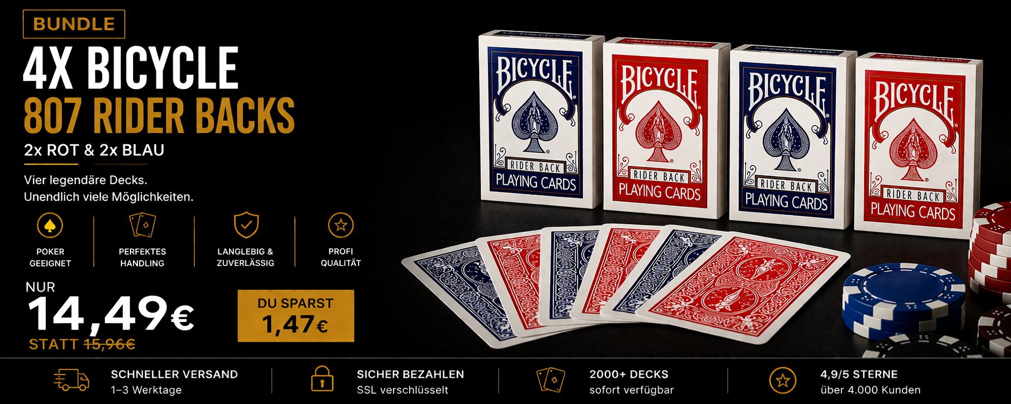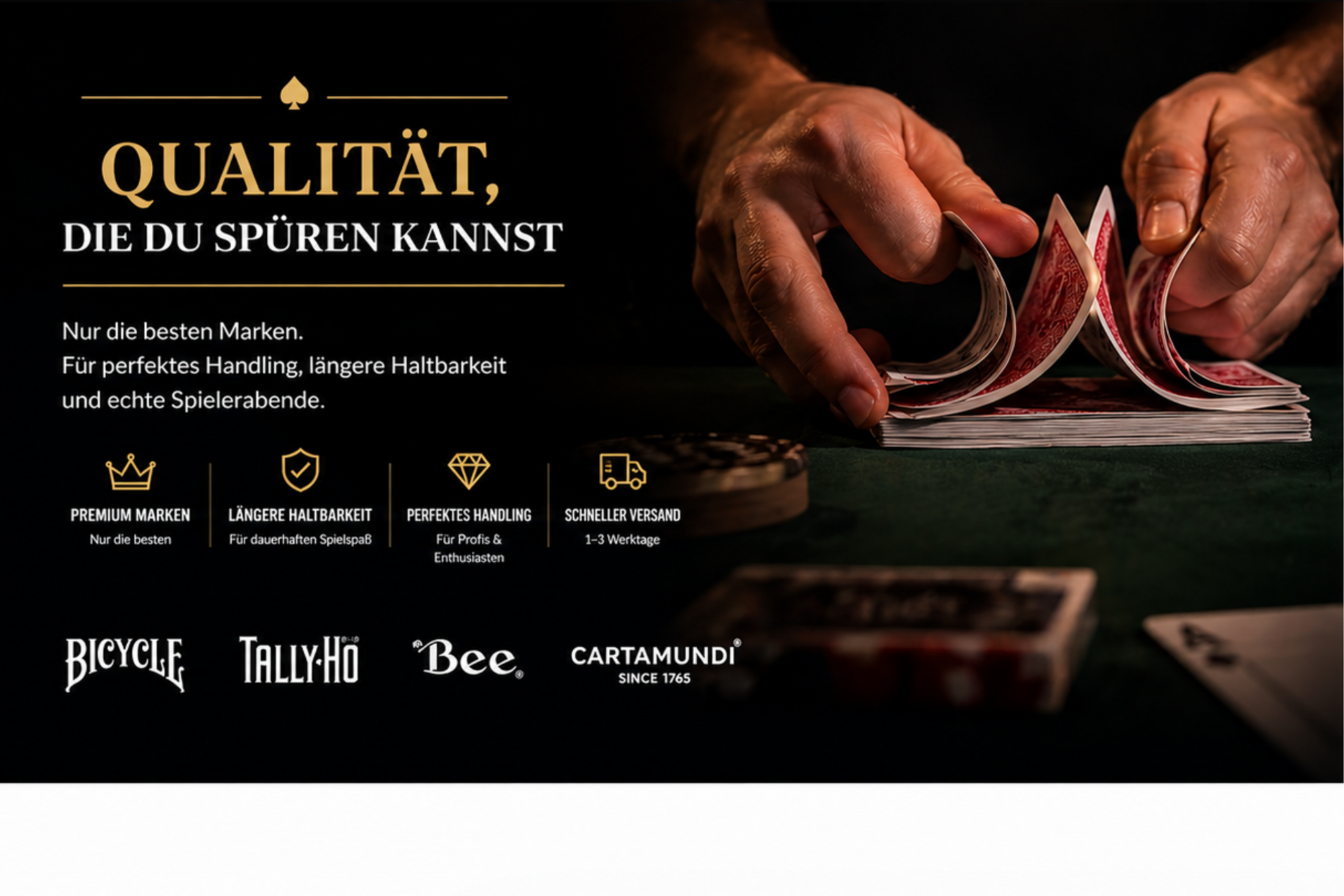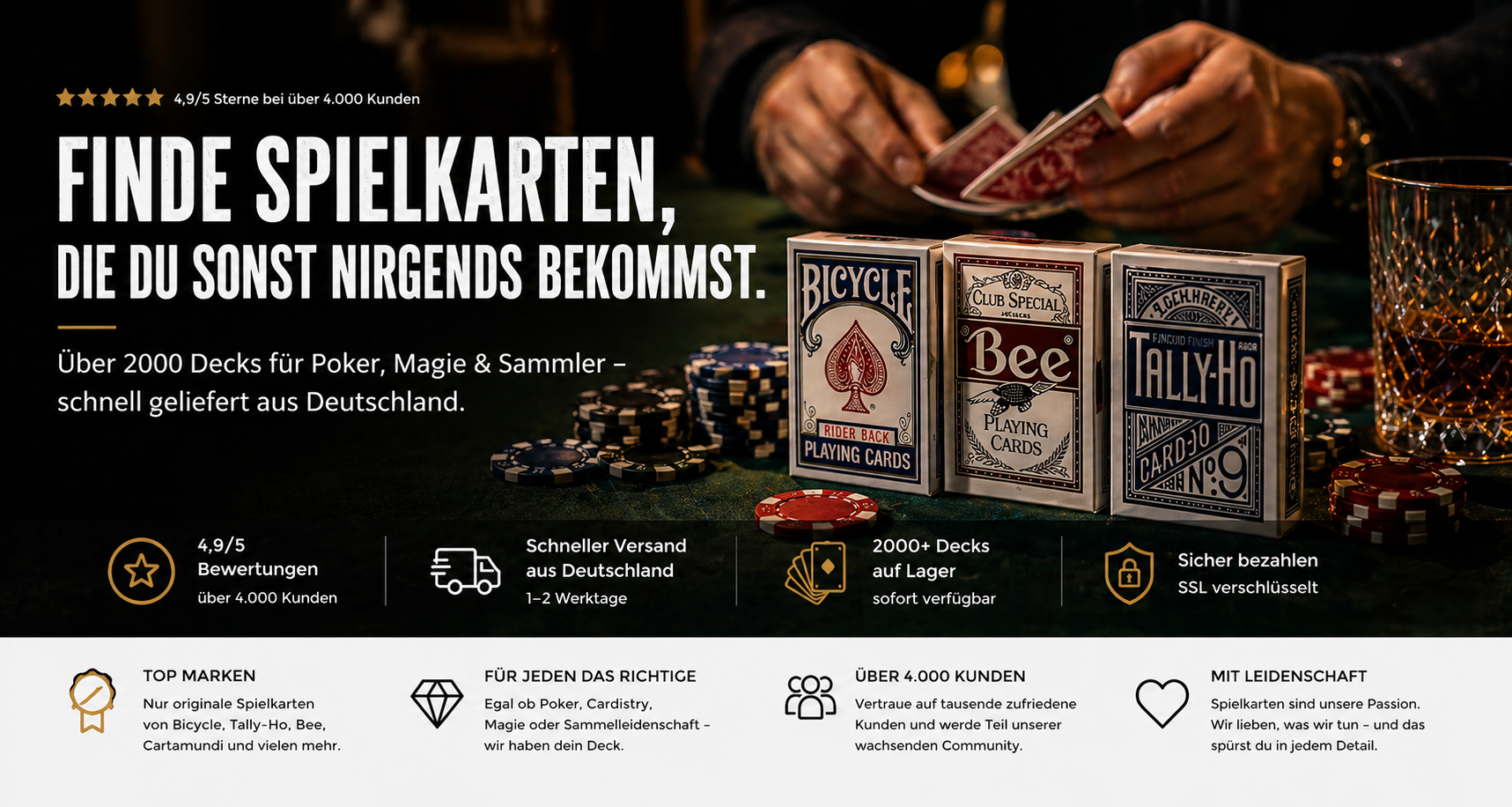 Spielkartenshop.com steht für eine einfache Bestellung, schnelle Lieferung und zuverlässigen Kundenservice. Egal ob du Spielkarten kaufen, Pokerdecks nachbestellen oder ein besonderes Kartenspiel suchst – bei uns bestellst du bequem online und erhältst geprüfte Qualität für jedes Kartenspiel.