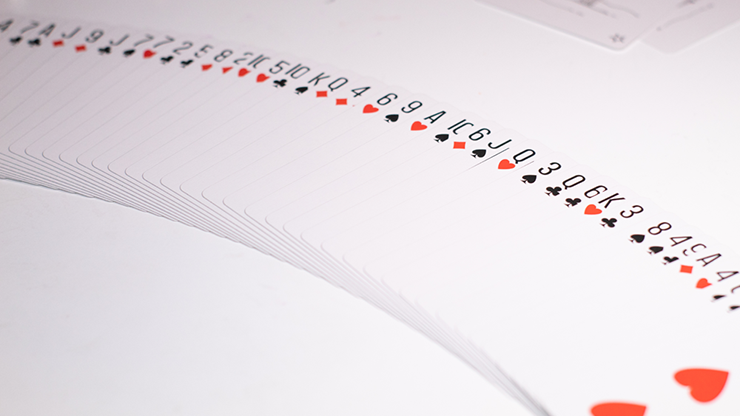 Die Steckschachtel zeigt die große Spatenspitze auf der Vorderseite und das Rückendesign auf der Rückseite. Um den Kartonrand herum befindet sich ein Nadelstreifen in Blau und Weiß. Zwischen den Zeilen ist der Rest der Info zu den Karten (zusammen mit einem schönen Rechtschreibfehler im Wort 'Spielen'). Wenn Sie die Tuck-Box öffnen, sehen Sie eine "Drei von Keulen"-Enthüllung. Dieses Deck birgt noch ein paar weitere Geheimnisse, aber nur Neugierige werden sie finden.