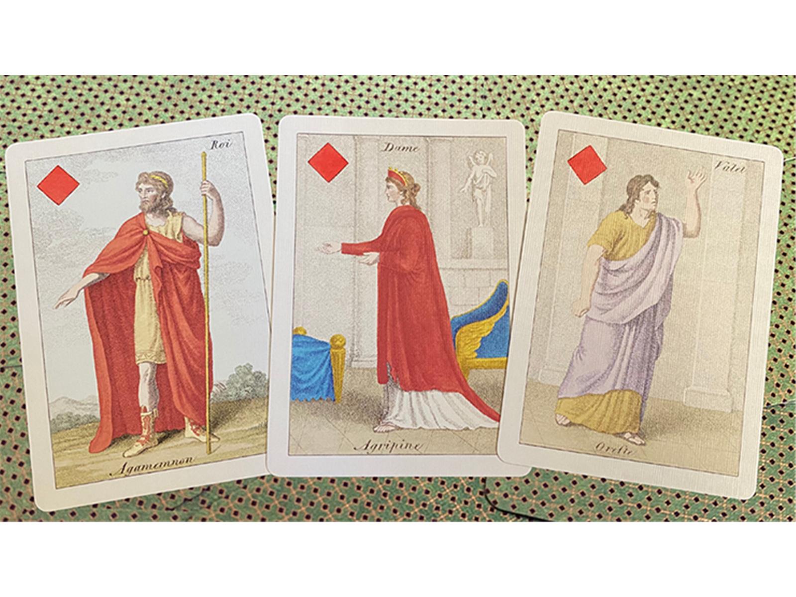 Die Bilder auf den Gerichtskarten sind die Charaktere der "griechischen und römischen Mythologie", die sich hauptsächlich um den Trojanischen Krieg drehen und von Jean Racines Stücken wie Iphigénie, Esther, Britannicus und dem "Andromaque" ("Andromache") inspiriert wurden, die erstmals im November zu sehen waren 17. 1667 vor dem Hof Ludwigs XIV. Im Louvre in den privaten Kammern der Königin Marie Thérèse, von der königlichen Gesellschaft der Schauspieler namens "Les Grands Comédiens", mit Thérèse Du Parc in der Titelrolle. Andromaque, als drittes von Racines Stücken, das im Alter von 27 Jahren geschrieben wurde, begründete den Ruf seines Autors als einer der großen Dramatiker in Frankreich.