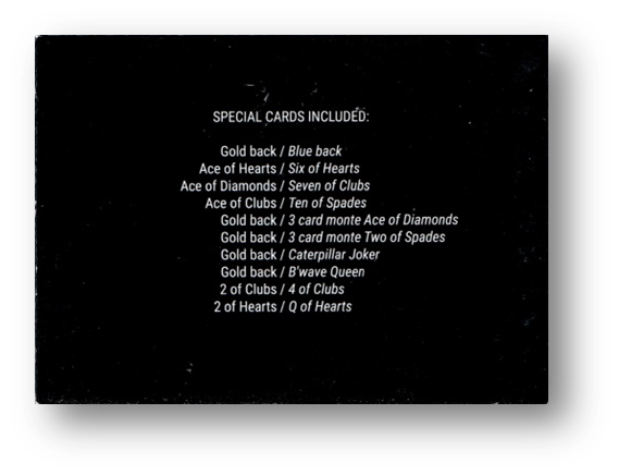 Hier finden Sie eine vollständige Liste der enthaltenen Gaff-Karten und der Tricks, für die sie entwickelt wurden: