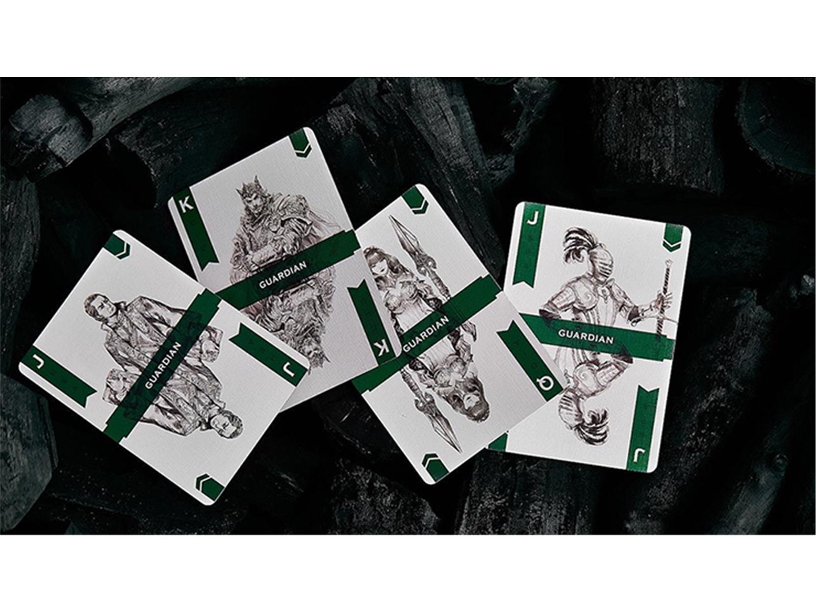 Alle Rückseiten mit den klassischen europäischen Flaggen im Viertelstil in den Farben Grün und Weiß sind gleich, sodass niemand herausfinden kann, welche Karten Sie halten. Als unverzichtbare und klassische Rolle in Videospielen über Mittelerde, einschließlich der Elder Scrolls, der Dark Souls oder der Dungeons & Dragons, ist der Wächter überall zu finden.