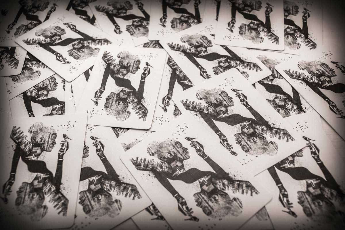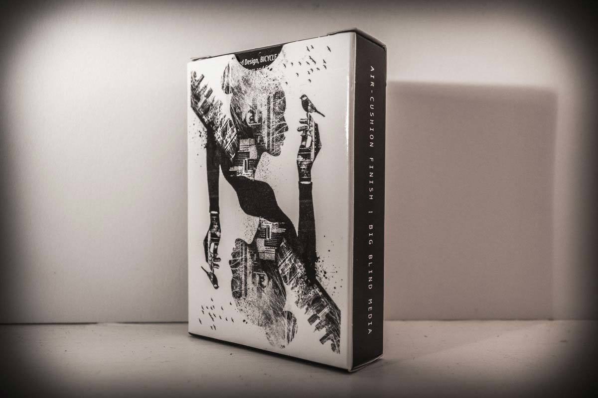 Dieser stark stilisierte Look wurde von dem bekannten französischen Künstler Sam Hayles bei Dose Productions mit einem klaren Schwarz-Weiß-Design kreiert. Der unglaubliche Doppelbelichtungsstil wird bei einem brandneuen Rückendesign, Ace Of Spades, zwei wunderschönen Jokern und einem atemberaubenden Tuck Case verwendet.