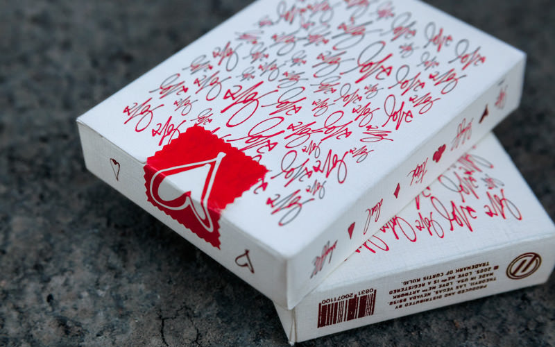 Die Karten enthalten ein originales Pik-As, einen Joker, ein Rückendesign, ein Box-Design, ein Aufkleber-Siegel und ein Herz-Ass - umbenannt in Ace of Love. Auffällig ist die Schachtel mit leuchtend roten Folienakzenten auf hochwertigem Feinleinenpapier.