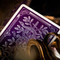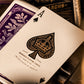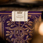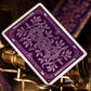 Spielkarten passend für einen König. Sie sehen aus, als gehörten sie in einen Palast. Goldfolie umgibt das elegante, dunkelviolette Boxdesign.