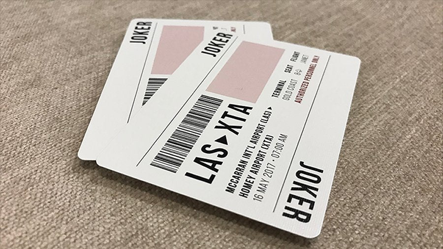 The playing cards showcase re-colored standard faces along with a classic and casino-inspired back design. You will find a pair of boarding pass Jokers making the deck quite unique. The cards are traditionally cut to provide the ability to weave or Faro shuffle facedown. The tuck box exhibits premium features with clear UV spot varnish and silver foil accents.