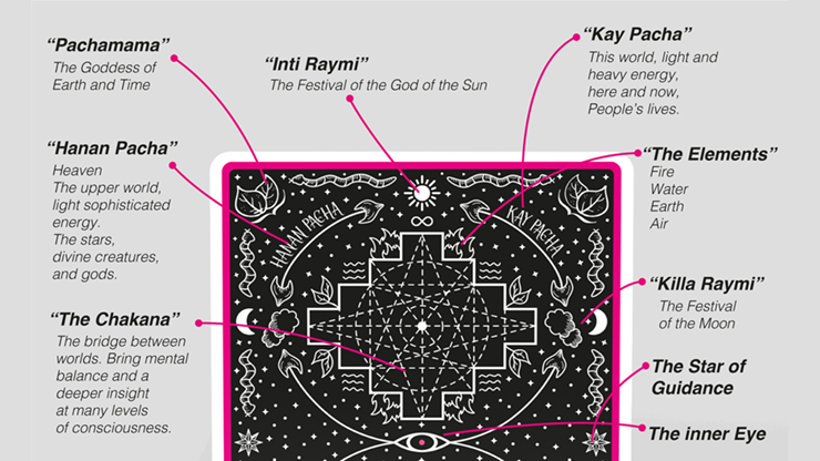 Inspired in an ancient mythologic symbol, the "CHAKANA," represents the path from the terrenal world "Kay Pacha" to the celestial world where the god lives. This is called "Hanan Pacha." These words are in Quechua, usually called Runasimi (the people's languages). It's an indigenous language spoken by the Quechua peoples, primarily living in the Peruvian Andes and highlands of South America.