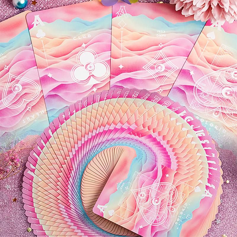 Spielkarten mit Regenbogenmotiven sind ein unverzichtbares Arsenal in der Tasche eines Kartenspielers. Sie brauchen keine super auffälligen Bewegungen oder Fähigkeiten, um eine schöne Bewegung in der Handfläche zu schaffen. Die rosafarbene Ausgabe der Rainbow Dream Spielkarten ist in Rosa und Gelb gehalten, wobei die Tinte schrittweise in die Leinwand eintaucht. Du bist jetzt der Architekt deines eigenen Traums, bewege deine Hände und lass dich von den Karten in eine alternative Traumwelt entführen.